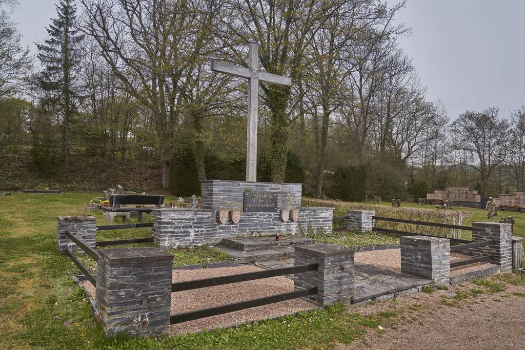 Inschrift: "Unseren Toten der ostdeutschen Heimat", vier Wappen